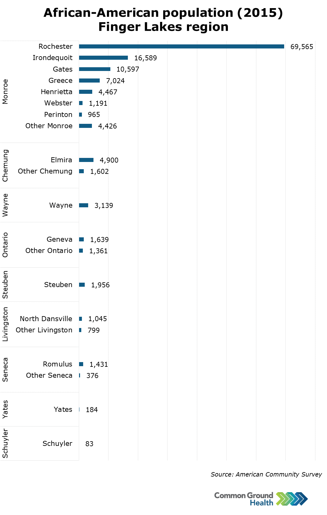 The table shows how the African-American population is distributed across the 9-county Finger Lakes region. Blacks are heavily concentrated in Monroe County, where 86 percent of the region’s African-Americans live. The city of Rochester is home to 52 percent of the African-Americans in the Finger Lakes region. Chemung County has the second-largest population, centered in Elmira.