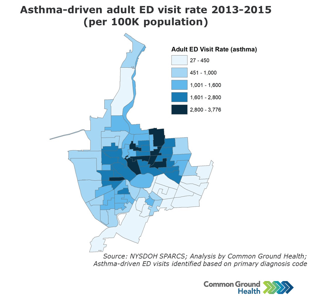 Even more striking is the difference in the rate of asthma-driven emergency department (ED) visits among adults. Analysis of hospital data from 2013-2015 showed the rate within the Focus Area* (1,563) was 3.5 times the rate for the rest of the city (447). The much larger disparity in the ED visit rate (compared to the disparity in asthma prevalence), suggests that within the Focus Area, people with asthma are less able to manage their chronic illness.