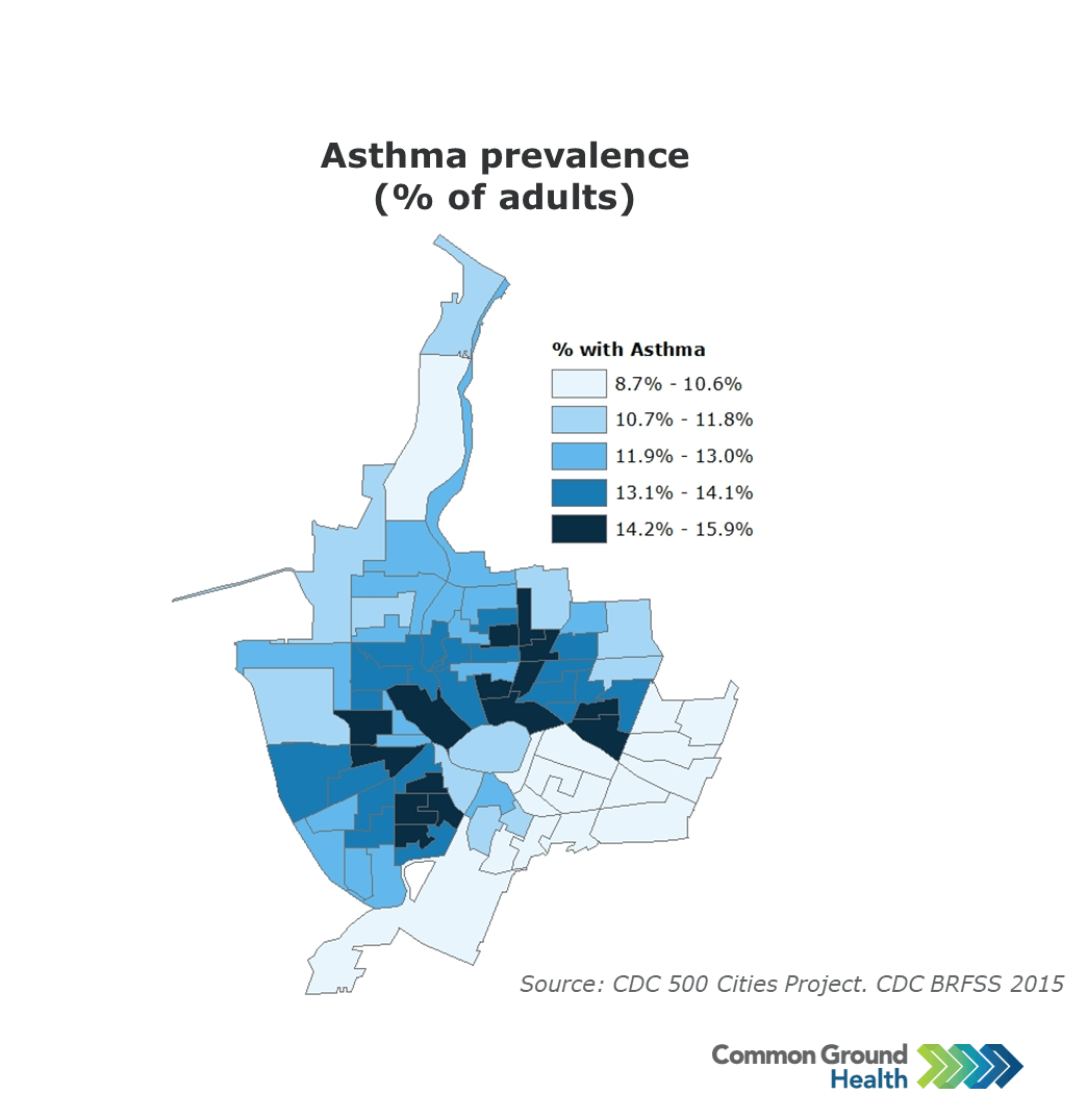 The map of CDC estimates below shows significantly higher rates of adult asthma in the Focus Area* tracts, compared to the rest of the city of Rochester. On average, the prevalence of adult asthma is estimated to be nearly 26 percent higher in the Focus Area compared to the rest of the city.