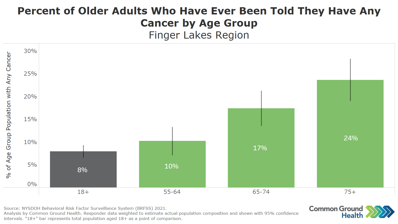 This chart is based on BRFSS survey data and displays the percentage of older adults in the Finger Lakes who have ever been told that they have any cancer. The "18+" bar enables a comparison of the older adults to the overall adult population. While the survey data shows no significant difference in the prevalence among those aged 55-64 compared to the overall adult (18+) population, the 65-74 and 75+ populations do show significantly higher prevalence of cancer. These age groups are approximately double and triple the overall adult percentage, respectively. With certain health conditions more prevalent among the older adult population, as well as the anticipated increase in older adults within the region over the next several decades, it will be important to continue to address workforce and availability of services for these individuals.