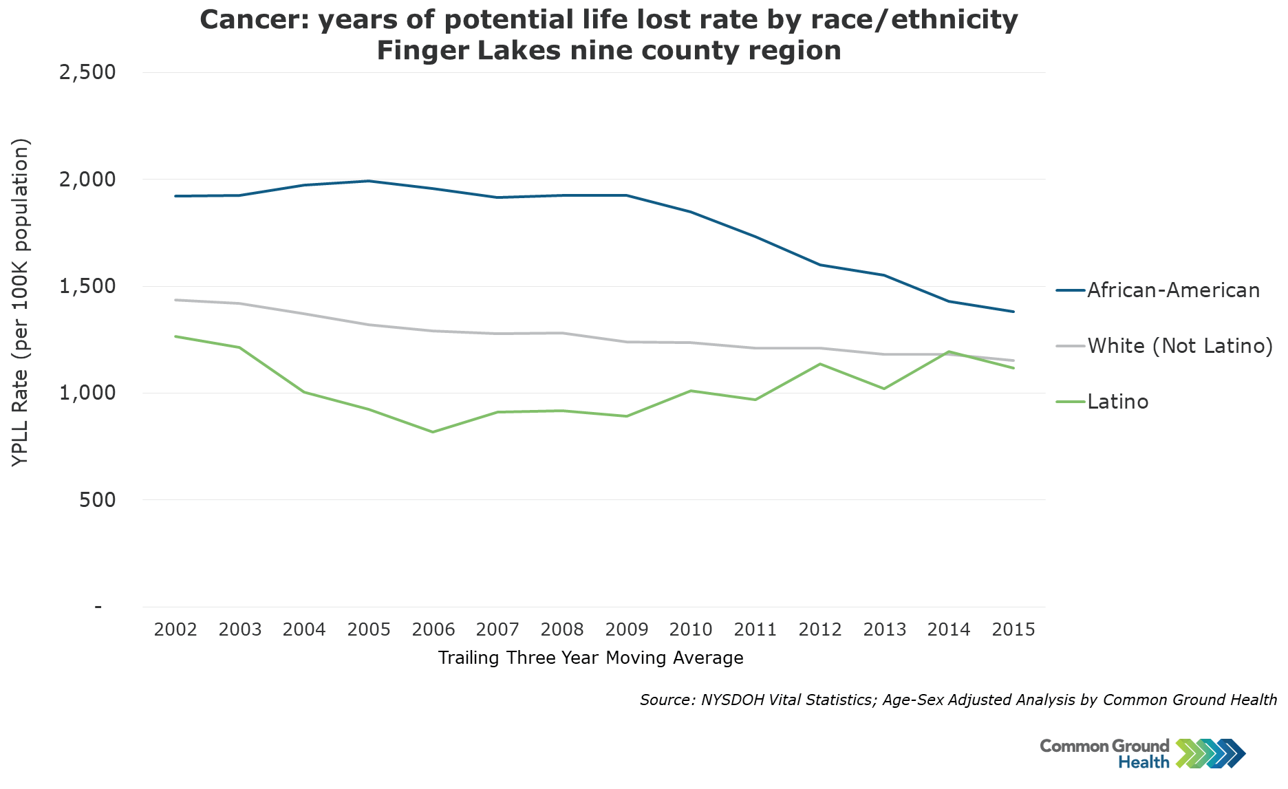 Methodology note: Years of potential life lost (YPLL) is a widely used measure to assess the rate of premature mortality. YPLL places a larger weight on the deaths of younger people, in contrast with overall mortality statistics which are dominated by deaths of the elderly. The YPLL rates in Common Ground Health analyses are derived using 75 years as the baseline. A death at age 65 has YPLL of 10, where as a death at age 35 has a YPLL of 40. The rates are calculated per 100,000 population and are age-sex adjusted to account for differences in population distribution.