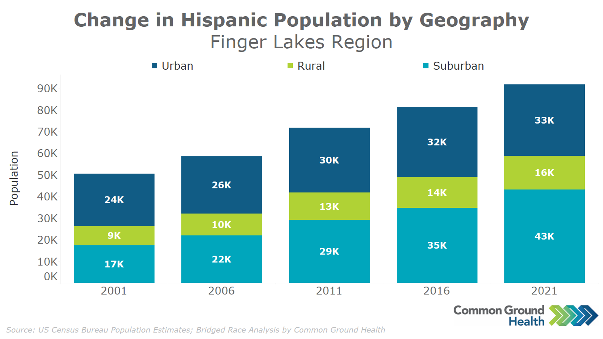 The chart shows the change in the Hispanic population by geography in the Finger Lakes Region. Overall, the Hispanic population has increased substantially, with notable growth across urban, suburban, and rural geographies.