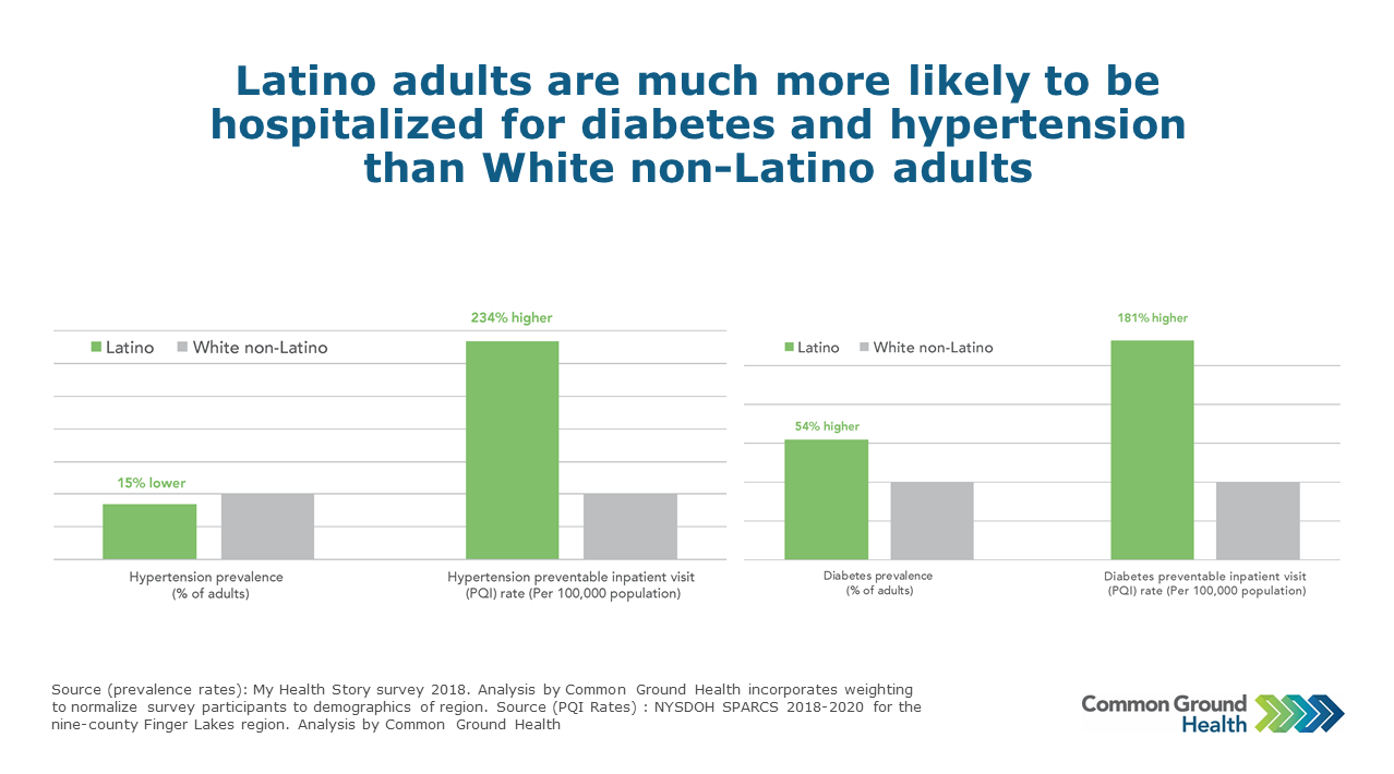 The charts compare chronic disease prevalence rates and preventable hospitalization rates between Latino and White non-Latino residents. Latino residents in the Finger Lakes region are 15% less likely than White non-Latino adults to have high blood pressure. Despite this, the rate of preventable hospital stays (PQI) for hypertension among Latino residents exceeds the rate of White non-Latino residents by 234%.