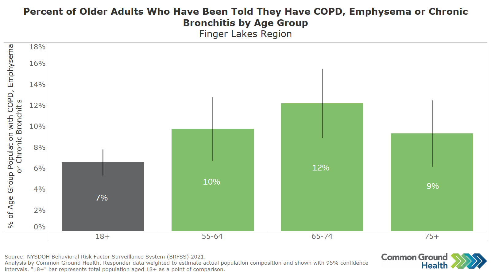 This chart is based on BRFSS survey data and displays the percentage of older adults in the Finger Lakes who have been told that they have COPD, emphysema, or chronic bronchitis. The "18+" bar enables a comparison of the older adults to the overall adult population. Of note, those aged 65-74 reported a significantly higher prevalence of respiratory disease than the overall adult population (18+). According to the Mayo Clinic, individuals with COPD have an increased risk for development of lung cancer, heart disease, and several other conditions.
