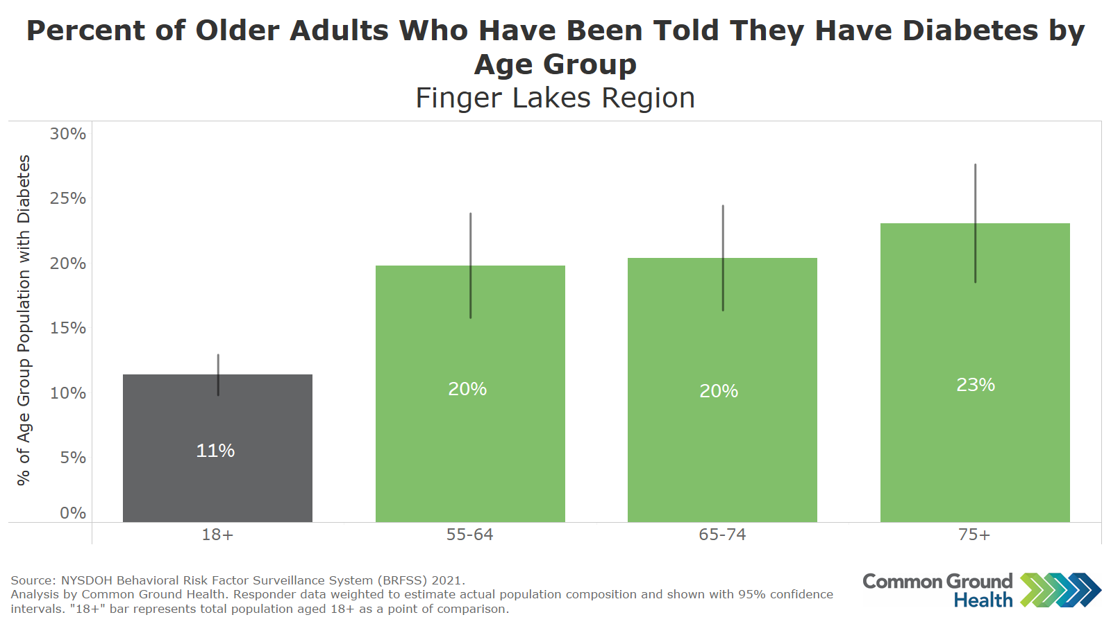 This chart is based on BRFSS survey data and displays the percentage of older adults in the Finger Lakes who have been told that they have diabetes. The "18+" bar enables a comparison of the older adults to the overall adult population. When comparing the 55+ population to the overall adult (18+) population, older adults have a significantly higher prevalence of diabetes, at approximately double the percentage. Age is, undeniably, one risk factor for development of diabetes, but with Type II diabetes there are many modifiable risk factors and evidence-based programs aimed at reducing risk and prolonging healthy living. These strategies are important for older adults as development of diabetes can increase risk of other health conditions including, but not limited to, heart disease, eye and vision concerns and poor kidney health.