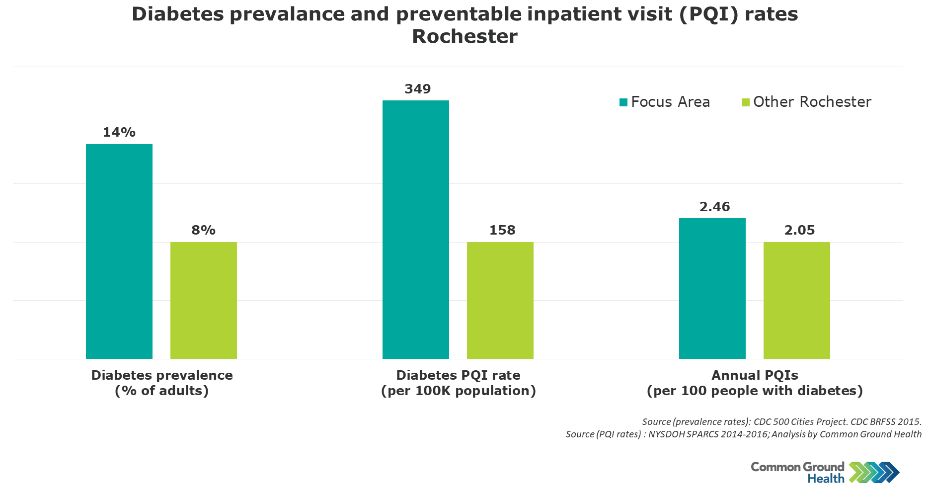 While it is expected that the rates of preventable inpatient visits (PQIs) due to diabetes would be higher in the areas and among populations with higher prevalence of diabetes, the PQI rate disparity is larger than can be explained by diabetes prevalence alone. The charts below compare the Focus Area* census tracts to the other tracts within the City of Rochester and show that the PQI rate disparity is proportionally larger than the prevalence disparity. This means that on average, the people with diabetes in the Focus Area are 20 percent more likely to have preventable hospitalization. This may be caused by differences in several factors: the severity of the condition; the ability to manage their condition; and, access to other clinical care that could prevent the need for hospitalization.