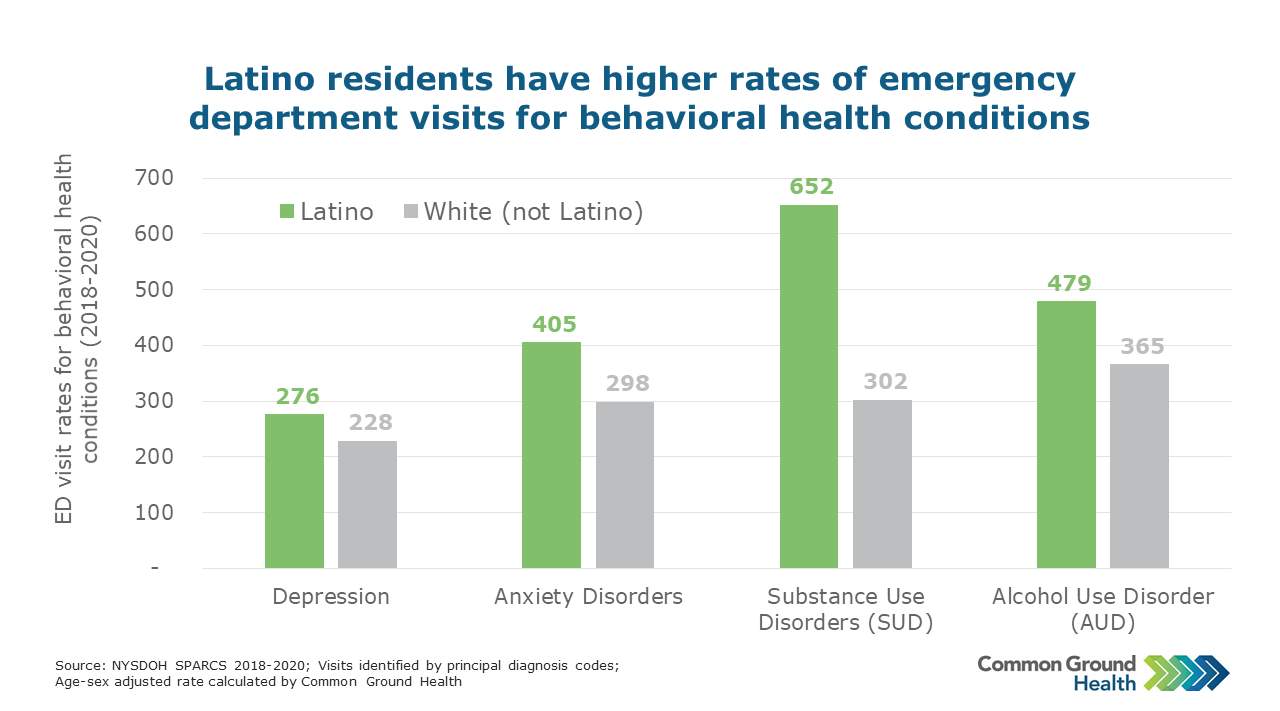The chart compares behavioral health related emergency department visit rates per 100,000 population between Latino and White non-Latino residents. Latino residents have higher rates of emergency department visit for behavioral health conditions than White non-Latino residents. Notably, Latinos visit the emergency department for substance use disorders (SUD) at twice the rate of White non-Latino residents.