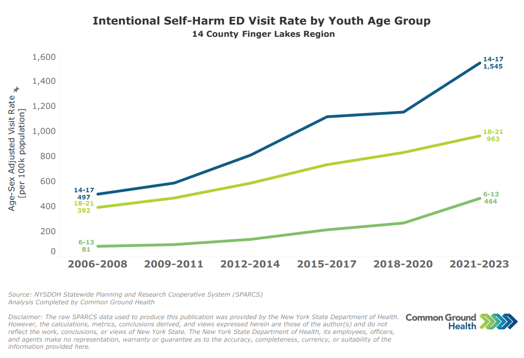 This chart displays self-harm related emergency department (ED) visit rates for youth within the 14-county Finger Lakes region over the past two decades. Rates have increased between 2006-2008 and 2021-2023 for all three age groups shown: 473% increase among youth aged 6-13, 211% increase for those aged 14-17, and a 146% increase for those aged 18-21. While the upward trend over time remained fairly consistent for youth 18-21, there was an acceleration in rates for the 6-13 and 14-17 age groups beginning in 2018-2020. By 2021-2023, the self-harm visit rate for youth aged 14-17 was more than three times the rate of the 6-13 age group and over one and a half times the rate of the 18-21 age group. Self-harm is often used to provide a sense of relief from feelings such as loneliness, anger or hopelessness. If help for this behavior is not secured, it can lead to a higher risk of suicide. For additional information on this topic please reference the Monroe County Behavioral Health Needs Assessment and the report titled So Much More than Academics: School-based Opportunities to Address Self-Harm among Youth.