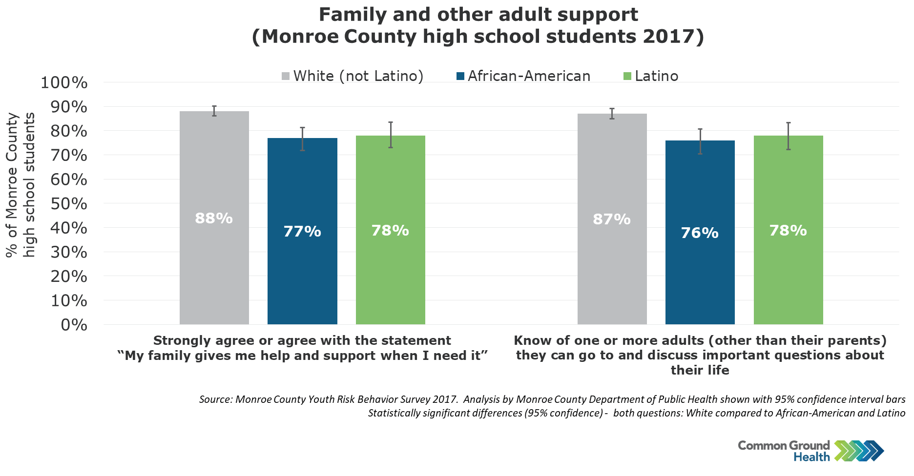 The Monroe County Youth Risk Behavior Survey asked high school students several questions about support available from family and the community.