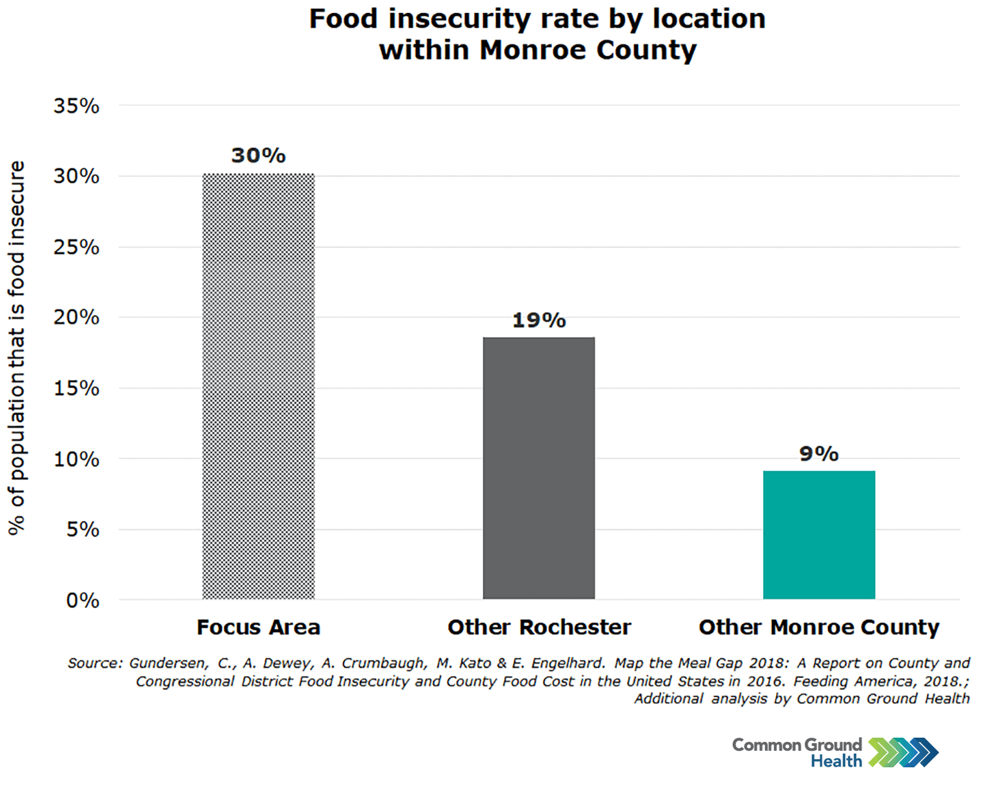 The Focus Area* tracts generally have the highest rates of food insecurity. Within the Focus Area, 30 percent of the population is estimated to be food insecure. This compares to 19 percent for other parts of Rochester, and 9 percent for the suburbs in Monroe County.