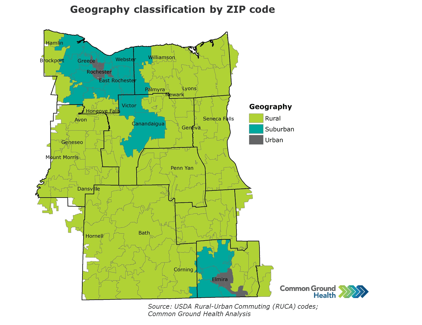To enable the analysis of geographically-related health disparities throughout this report, each ZIP code was labeled urban, suburban or rural. The designations were driven by the USDA’s Rural-Urban Commuting (RUCA) codes, which were developed based on population density, urbanization and daily commuting patterns. For this health equity analysis, ZIP codes with RUCA 2-10 are designated as rural areas. The USDA’s RUCA 1 ZIP codes in Rochester and Elmira are designated as urban areas, and the other RUCA 1 ZIP codes are designated as suburban.