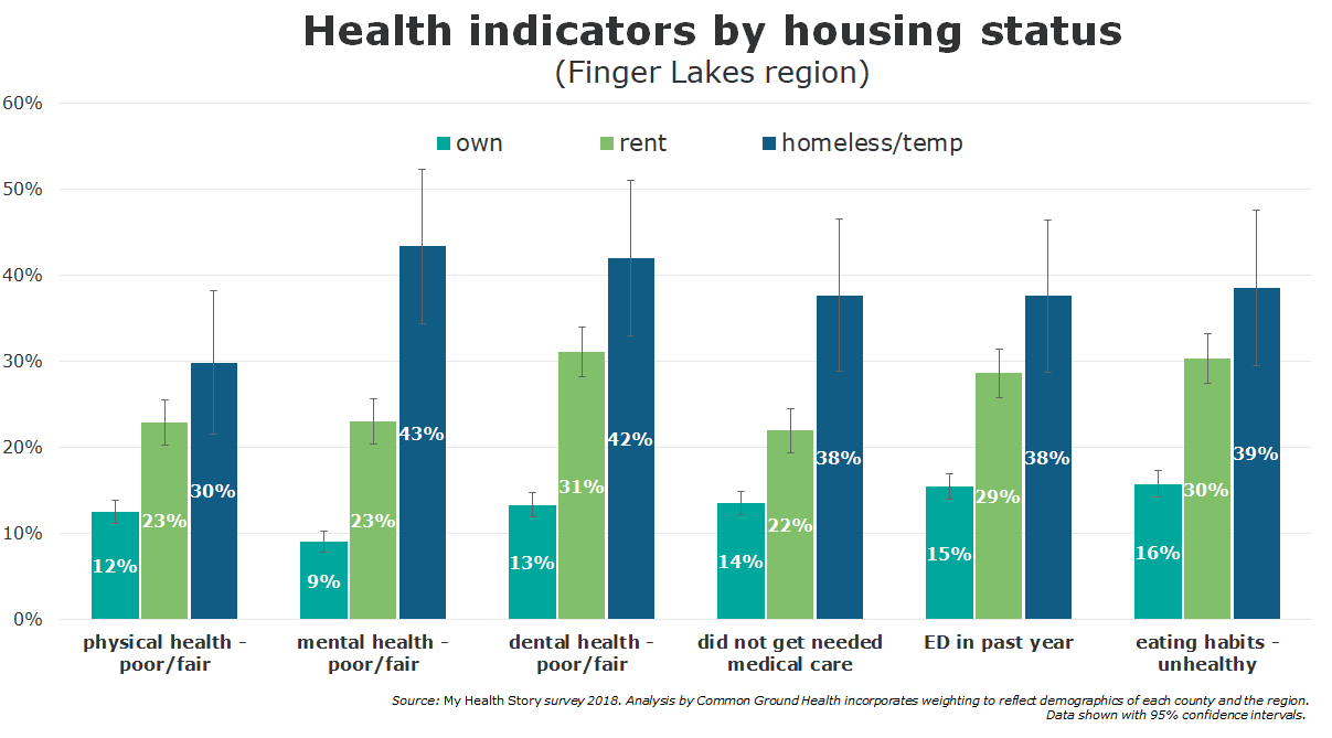 There is a strong relationship between housing status and a wide range of health indicators. As summarized below, survey data shows that renters are much more likely than home owners to report poor or fair health, to go without needed medical care, to use the ED, and to have unhealthy eating habits. And the data for those who are living in temporary housing or are homeless highlight a particularly stark pattern of larger health issues.
