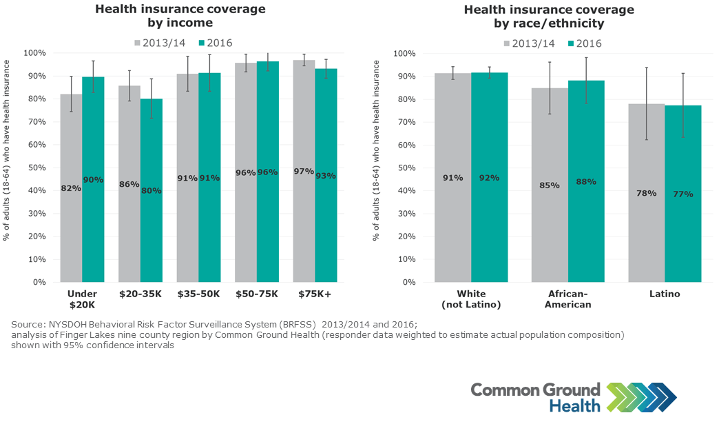 While survey data for the region suggests increased health insurance coverage rates for some populations from 2013/2014 to 2016, these changes are not statistically significant. The largest directional change is an increase from 82 percent to 90 percent coverage for the lowest income segment, which would be consistent with the Medicaid expansion provisions of the Affordable Care Act.
