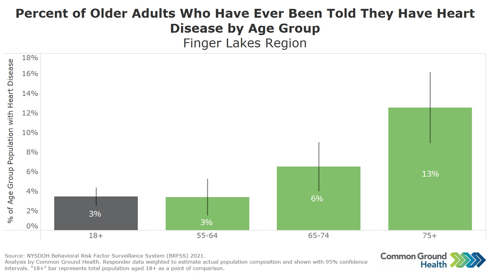 This chart is based on BRFSS survey data and displays the percentage of older adults in the Finger Lakes who have ever been told that they have heart disease. The "18+" bar enables a comparison of the older adults to the overall adult population. When compared to the 18+ population, the percentage of adults aged 65-74 with heart disease is nearly double, and is over quadrupled for the 75+ population. According to the National Institute on Aging, heart disease is a major cause of disability that limits activity and diminishes quality of life.