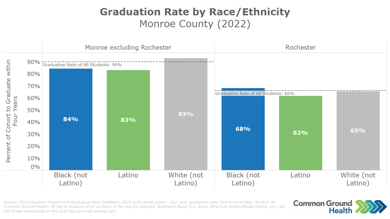 The chart shows graduation rates throughout the Finger Lakes Region. The graduation rate is defined as the percentage of students from the 2018 ninth grade cohort that graduated on-time in 2022.