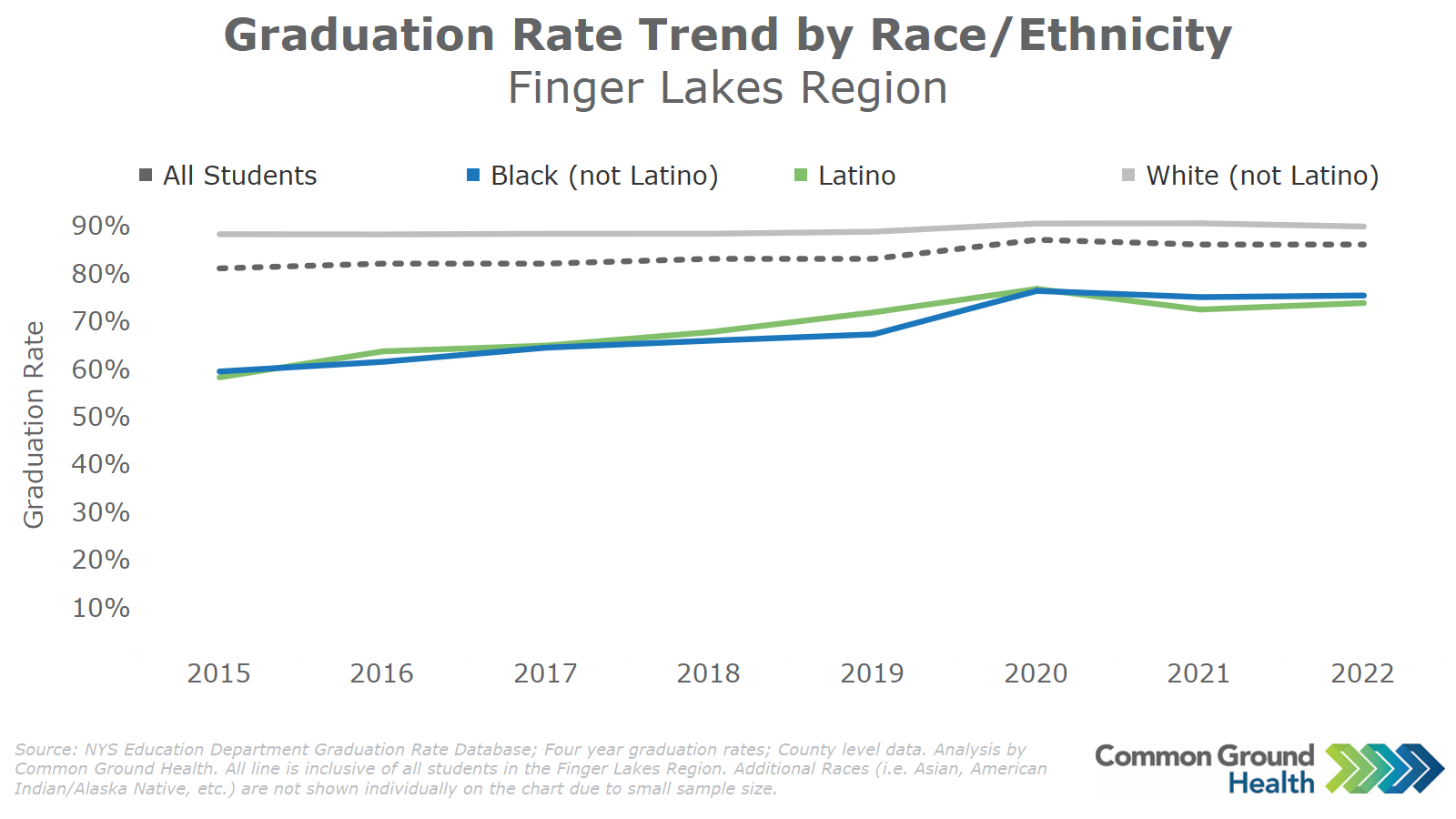The chart shows high school graduation rates by race and ethnicity within the Finger Lakes region. The graduation rate is defined as the percentage of students graduating on-time in the years of 2015 to 2022. While the graduation rates for Black non-Latino and Latino students have been increasing over time, they are consistently lower than the graduation rates of White non-Latino students.