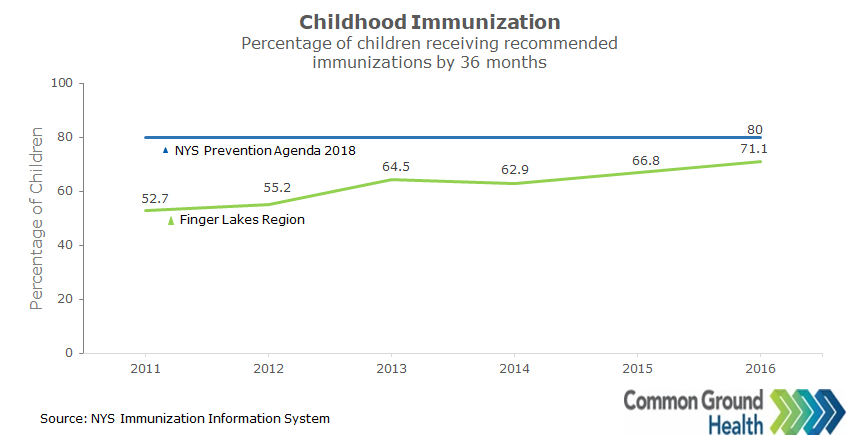 In the Finger Lakes region, the percentage of children receiving recommended immunizations by 36 months was below the New York State Prevention Agenda Benchmark of 80%. In 2016, the immunization percentage was the highest at 71.1%.