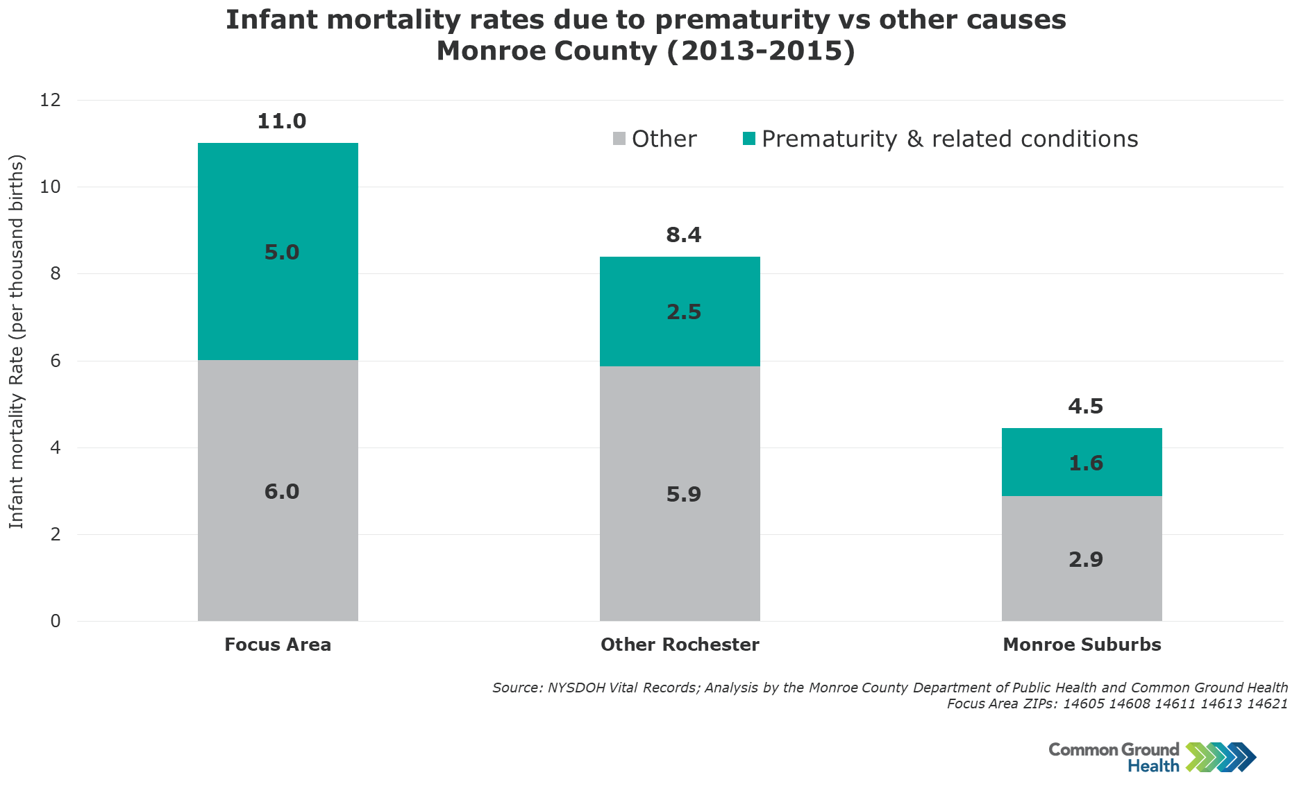 The chart below shows that prematurity is a major driver of the overall disparity in infant mortality. The significantly higher infant mortality rate in the Focus Area* compared to the rest of Rochester is explained entirely by prematurity and related conditions – there is no significant difference in the mortality rate for other causes. In the suburbs compared to the city, the infant mortality rate due to prematurity is even lower, as is the rate for other causes.