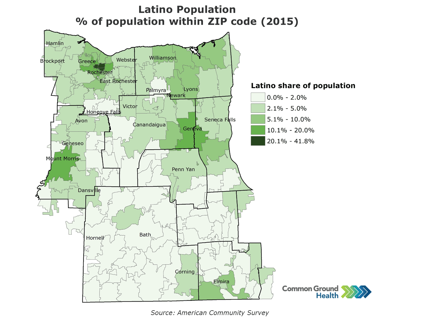 The map shows the concentration of Latinos within each ZIP code in the Finger Lakes New York region. The only areas where Latinos represent over 20 percent of the population are several ZIP codes in Rochester. The concentration of Latinos is generally very low in the Southern Tier counties, with the exception of areas near Elmira and Corning.