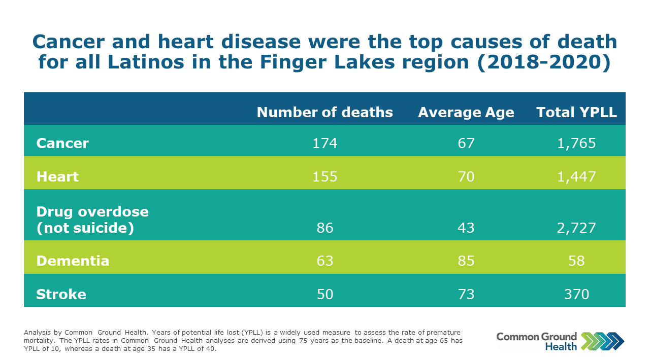The table shows the number of deaths, average age at time of death, and total years of potential life lost (YPLL) for the five leading causes of death among Latino residents from 2018-2020. Cancer and heart disease are the top causes of death for all Latinos in the Finger Lakes region. However, unintentional drug overdoses are the leading cause of premature death, with the most years of potential life lost and the lowest average age at time of death.