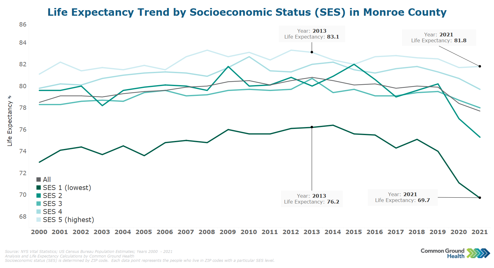Life expectancy was steadily increasing in the Monroe County until 2013 but has declined since then. In 2013 the life expectancy for the region was 80.8 years but it has fallen to 77.7 years, the lowest life expectancy recorded since 2000. Analysis of causes of death has shown that the key reasons for the decrease in life expectancy are drug overdoses, COVID, homicide, and suicide.