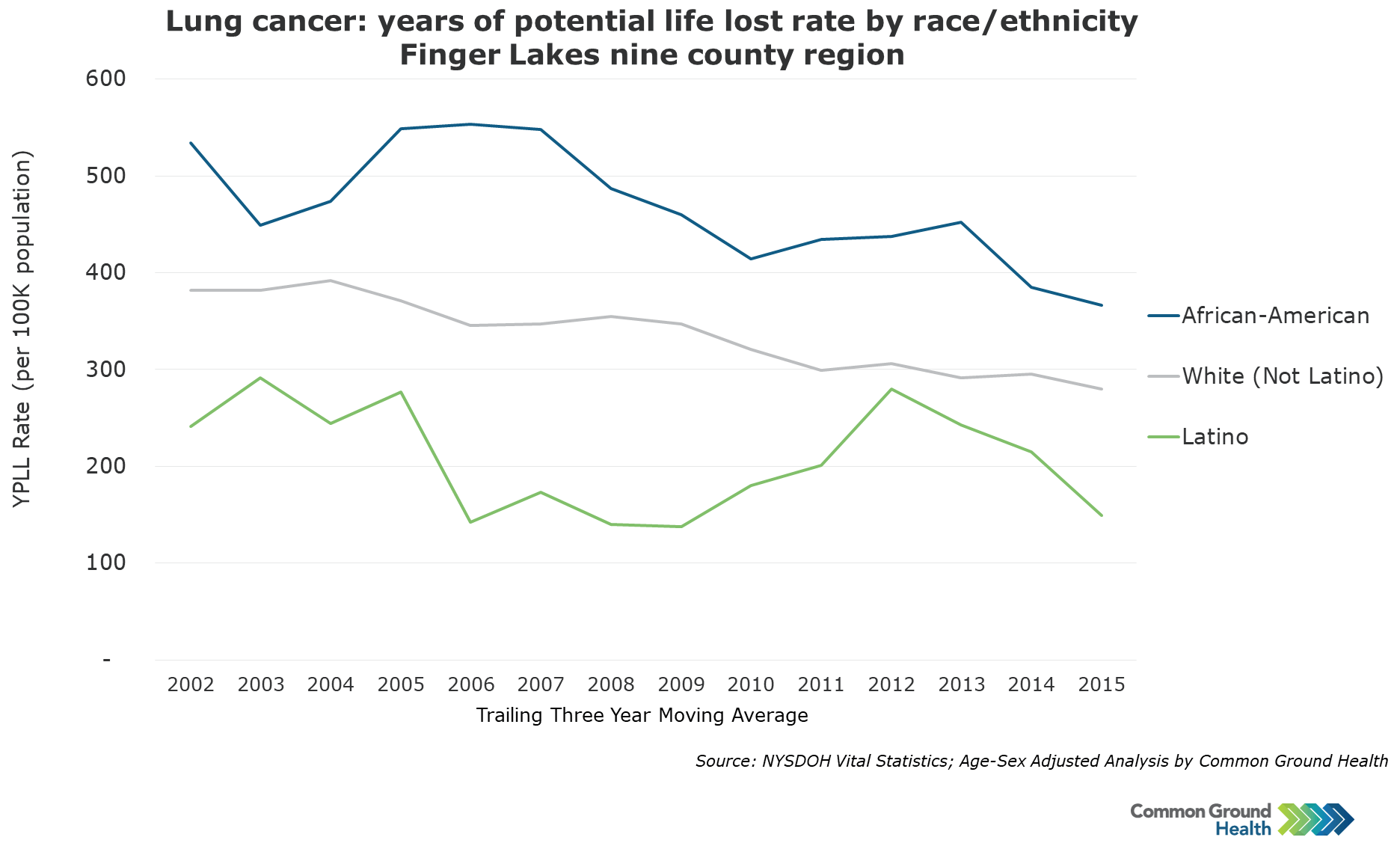 Methodology note: Years of potential life lost (YPLL) is a widely used measure to assess the rate of premature mortality. YPLL places a larger weight on the deaths of younger people, in contrast with overall mortality statistics which are dominated by deaths of the elderly. The YPLL rates in Common Ground Health analyses are derived using 75 years as the baseline. A death at age 65 has YPLL of 10, where as a death at age 35 has a YPLL of 40. The rates are calculated per 100,000 population and are age-sex adjusted to account for differences in population distribution.
