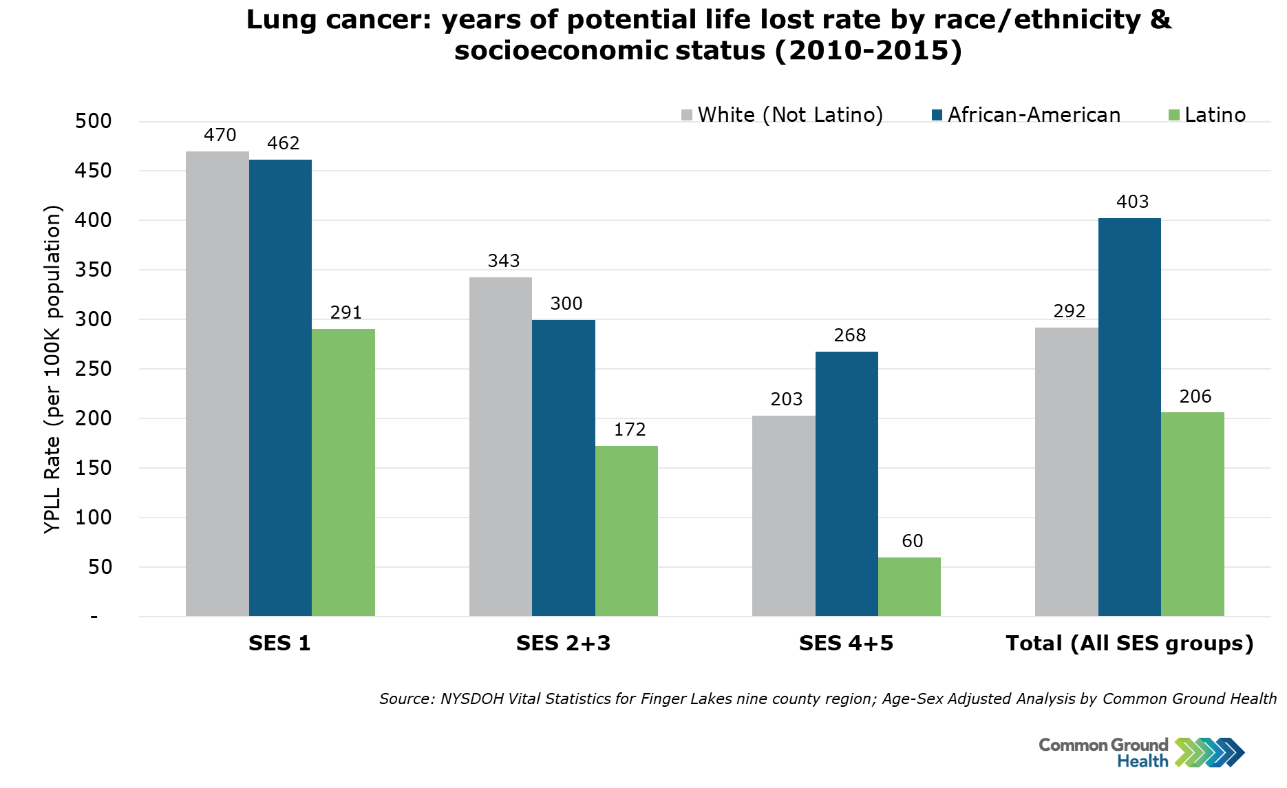 This chart highlights the strong disparity in lung cancer across the socioeconomic spectrum. For all three racial/ethnic groups, the YPLL rate is much higher among the SES 1 population compared to SES 4 and 5. Notably, the rates at each SES level are fairly similar for the white and black populations, and significantly lower for Latinos. This suggests that the overall disparity in lung cancer YPLL seen for African-Americans in the last set of bars is explained primarily by the population’s concentration in SES 1.