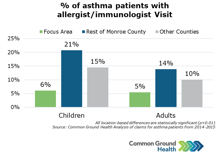 Additional claims analysis for patients with asthma highlights a disparity in the use of specialist care. Compared to the Focus Area*, children in the rest of Monroe County were 3.5 times as likely to see an allergist/immunologist; and adults were 2.5 times as likely. Utilization of specialists in the other counties is lower than Monroe County, but much higher than the Focus Area.