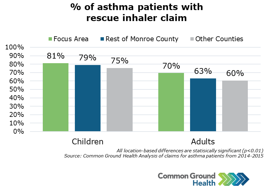 In contrast with control medications, there is a higher rate of rescue inhaler claims in the Focus Area* compared to the other areas. A hypothesis to explain the difference is that the control medications may be viewed as more discretionary, and therefore deprioritized among families that need to make tough choices about spending limited resources, such as time and money, on prescriptions.