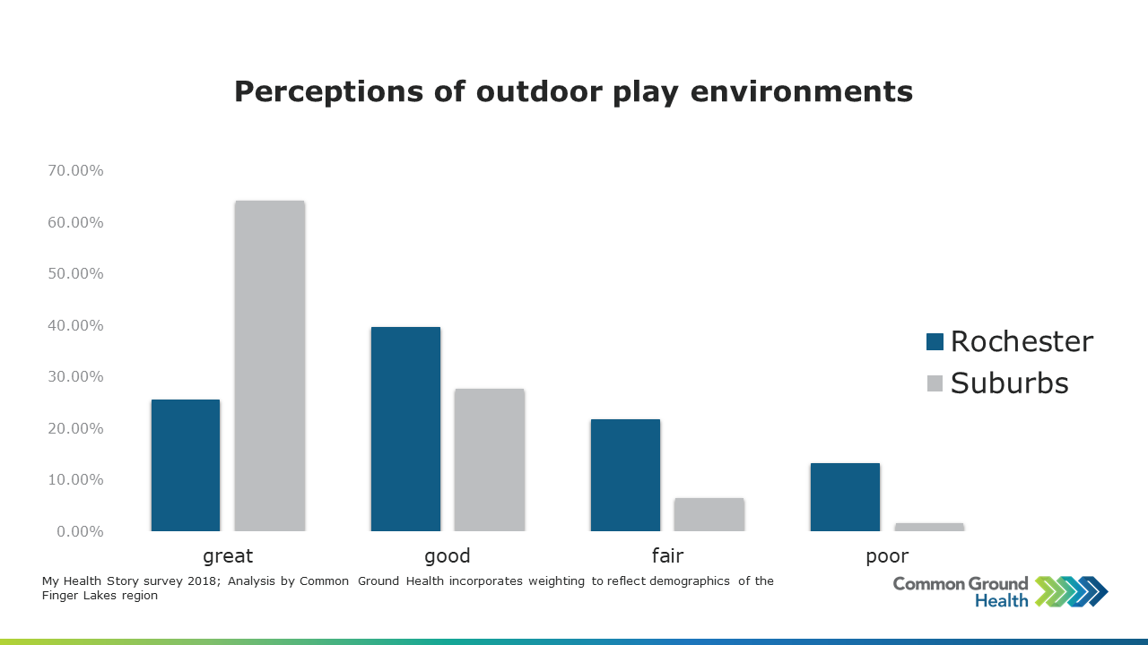 Getting exercise and engaging in unstructured play are important foundations for children’s health and well being. But parents who believe that their neighborhoods as unsafe may not allow their children to play outdoors. In the 2018 My Health Story survey, only 25% of Rochester residents rated their neighborhoods as great for outdoor play, compared to more than 60% of suburban residents.