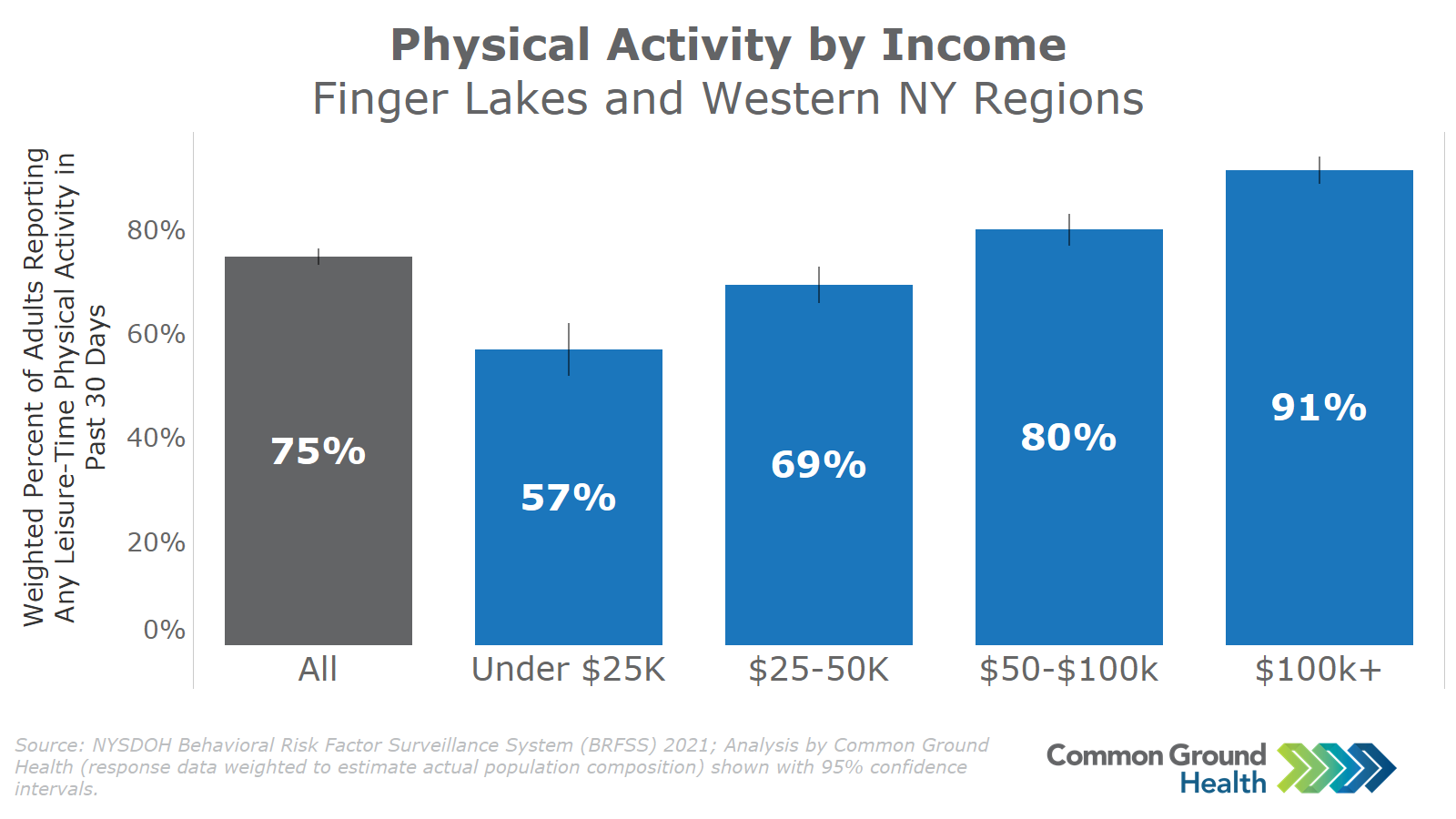 This chart uses Behavioral Risk Factor Surveillance System (BRFSS) survey data to estimate the percentage of adults engaging in any leisure time physical activity in the past 30 days. There is a clear relationship between physical activity and income levels. Those reporting lower income levels were the least likely to report physical activity, and every increase in income level demonstrates an increase in the proportion of respondents reporting leisure time exercise.