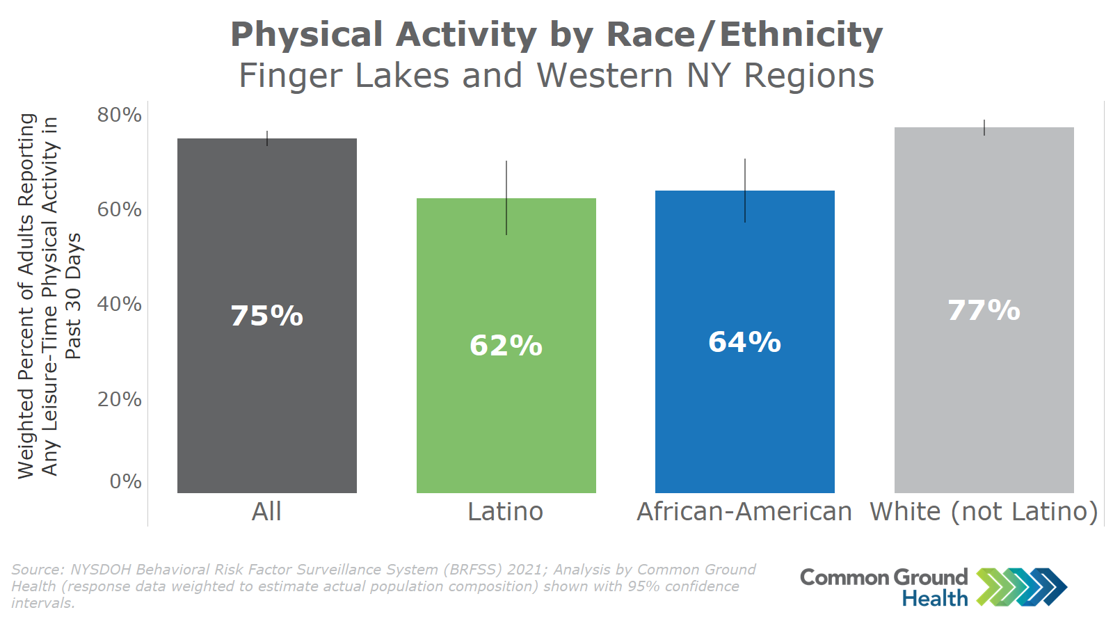 This chart uses Behavioral Risk Factor Surveillance System (BRFSS) survey data to estimate the percentage of adults engaging in any leisure time physical activity in the past 30 days. Overall, three out of four adults in the Finger Lakes and Western New York regions said that they exercised in the last 30 days. However, this varies by race and ethnicity. White non-Latino respondents are more likely to report leisure time exercise than Latino and Black non-Latino respondents.