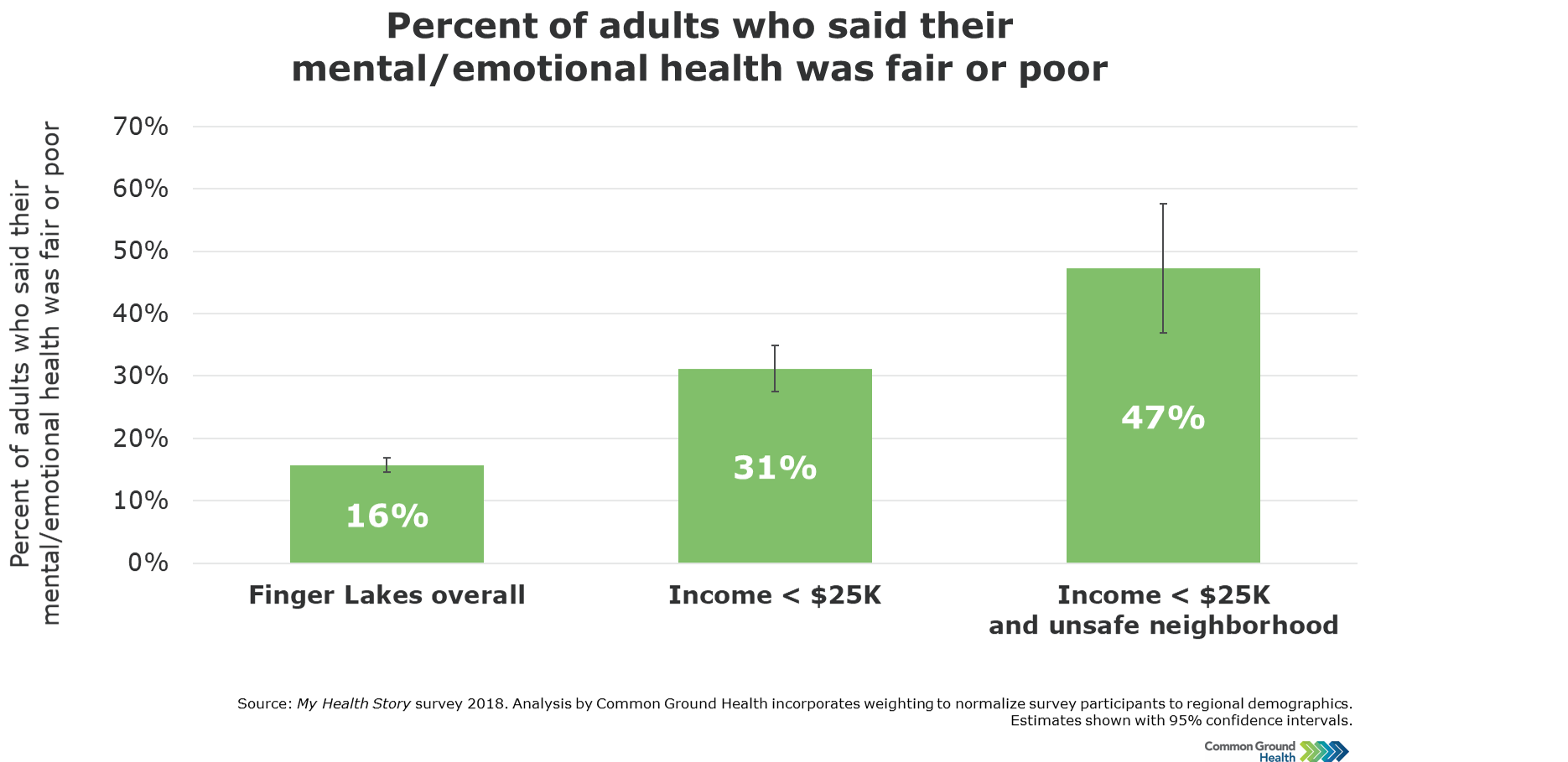 The layered impact of the many stresses and challenges of living with financial instability leads to higher rates of poor mental health among the low income population. Analysis of the 2018 My Health Story survey results found that 31% of adults with household income below $25K reported fair or poor mental/emotional health, which was nearly double the rate among the overall population (16%). And among those with low income living in a neighborhood they assessed as unsafe, nearly half reported fair or poor mental/emotional health.