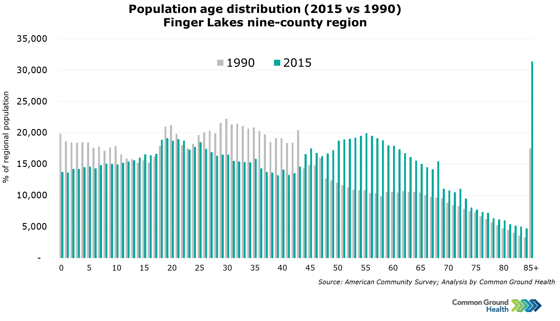 The chart shows how the age distribution has shifted significantly since 1990, as baby boomers have moved past their prime working years and people are living longer. The median age in the Finger Lakes region has increased from 33 in 1990 to 40 in 2015.