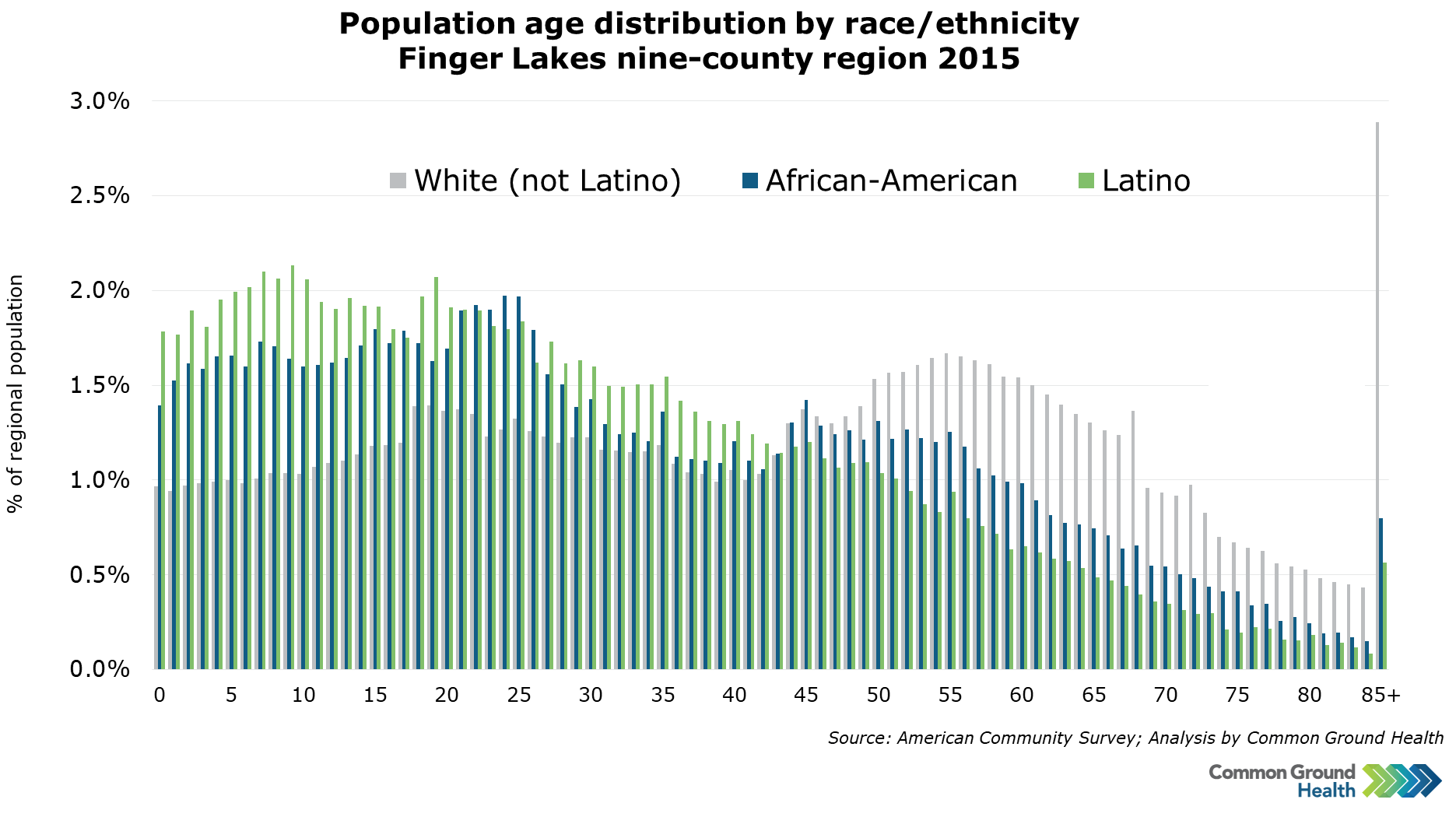 In the Finger Lakes region, the combined effects of increased racial/ethnic diversity and aging have a large impact on the population mix. Latino and African-American populations are significantly younger than the white population. The median age of the Latino population is 25, compared to 29 for African-Americans and 44 for whites in the region.