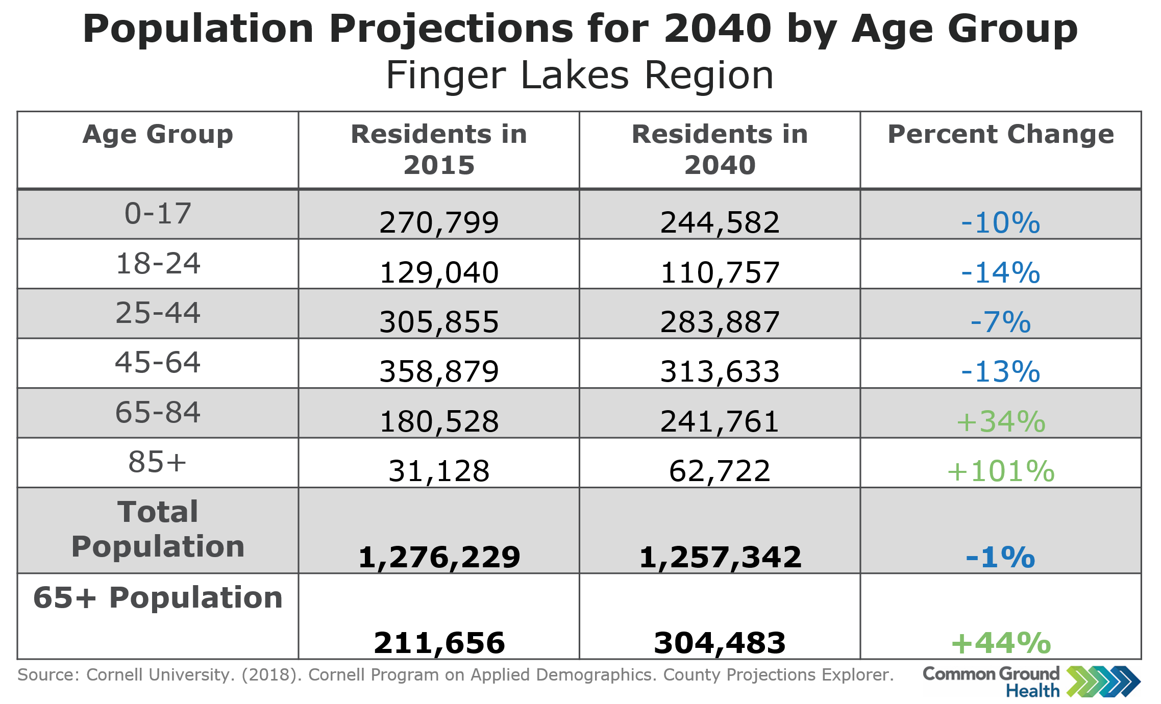 This chart displays population projections for the year 2040 for the Finger Lakes region by age group, as well as the percent change from 2015 to 2040. Percent change shows an anticipated decrease in overall residents within the region, with those aged 0-64 driving that decrease. However, an increase is expected in the number of older adults, and the 85+ population is projected to double in size. This shift in population could present additional workforce and caregiving challenges when it comes to serving the older adult population within the Finger Lakes region. This data visualization is part of the Sage II Commission Report.