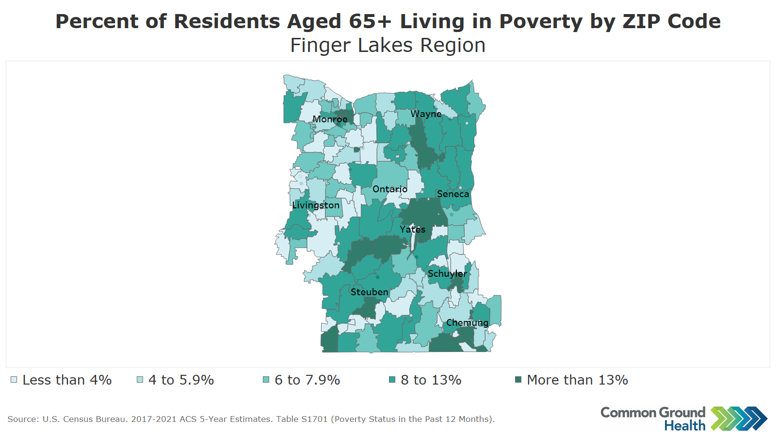 This map displays the percentage of the 65+ population who is living below poverty level by ZIP code. While poverty among older adults is widespread throughout the region, there is a noticeable band of ZIP codes that starts in Steuben County and runs northeast to Wayne County where 8% or more of older adults (per ZIP code) live in poverty. Economic security and increasing poverty for older adults is a significant concern as cost of living continues to rise; even older adults with incomes above, or well above, the Federal Poverty Level are struggling to keep up with increasing costs of food, housing, utilities and health care.
