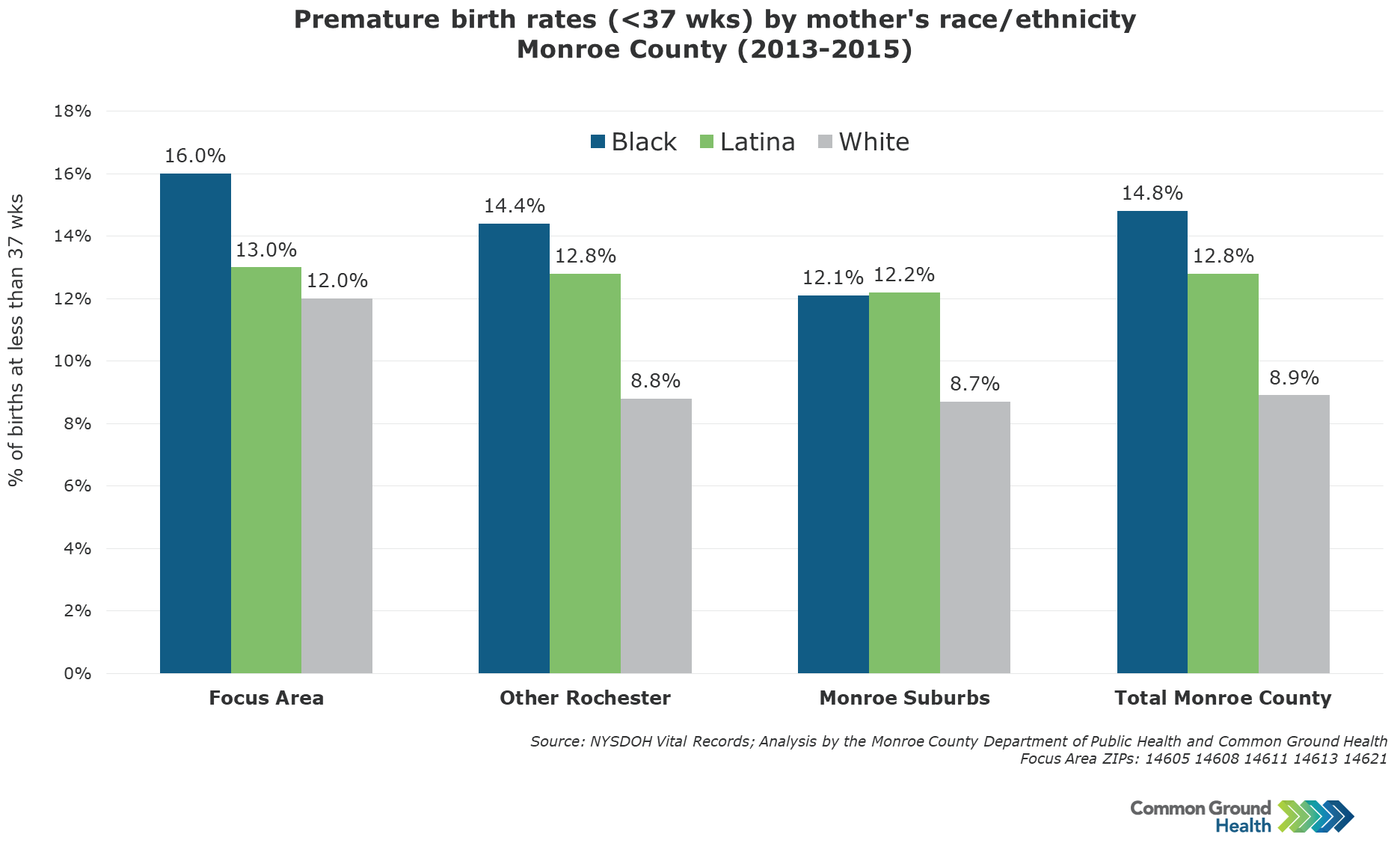 Premature birth rates vary not only by location within Monroe County, but also by race and ethnicity. Across Monroe County, the African-American and Latina premature birth rates are significantly higher than for whites. It is striking that while the rates are generally lower in the suburbs, for African-American women, the suburban rate is the same as the white rate in the Focus Area* of the city. It is also notable that the extent of these disparities is even larger when looking at the parallel analysis of very premature birth (< 32 weeks) rates.