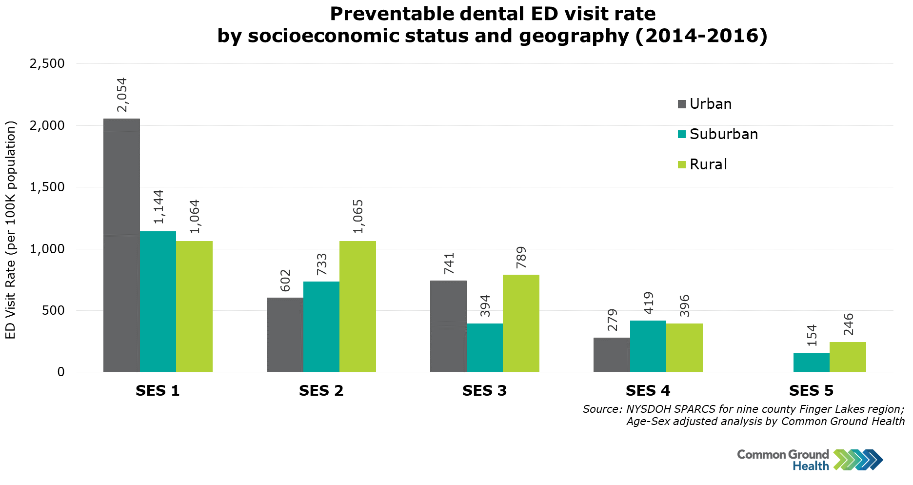 Methodology note: The SES index ranking was developed by Common Ground Health and calculated using a variety of socioeconomic indicators from the American Community Survey including average income, poverty rates, education levels, housing value, and homeownership. Each ZIP code is assigned a socioeconomic (SES) index ranking from 1 to 5. The lower SES ZIP codes tend to have lower average income, higher poverty rates, lower prevalence of college degrees, etc.