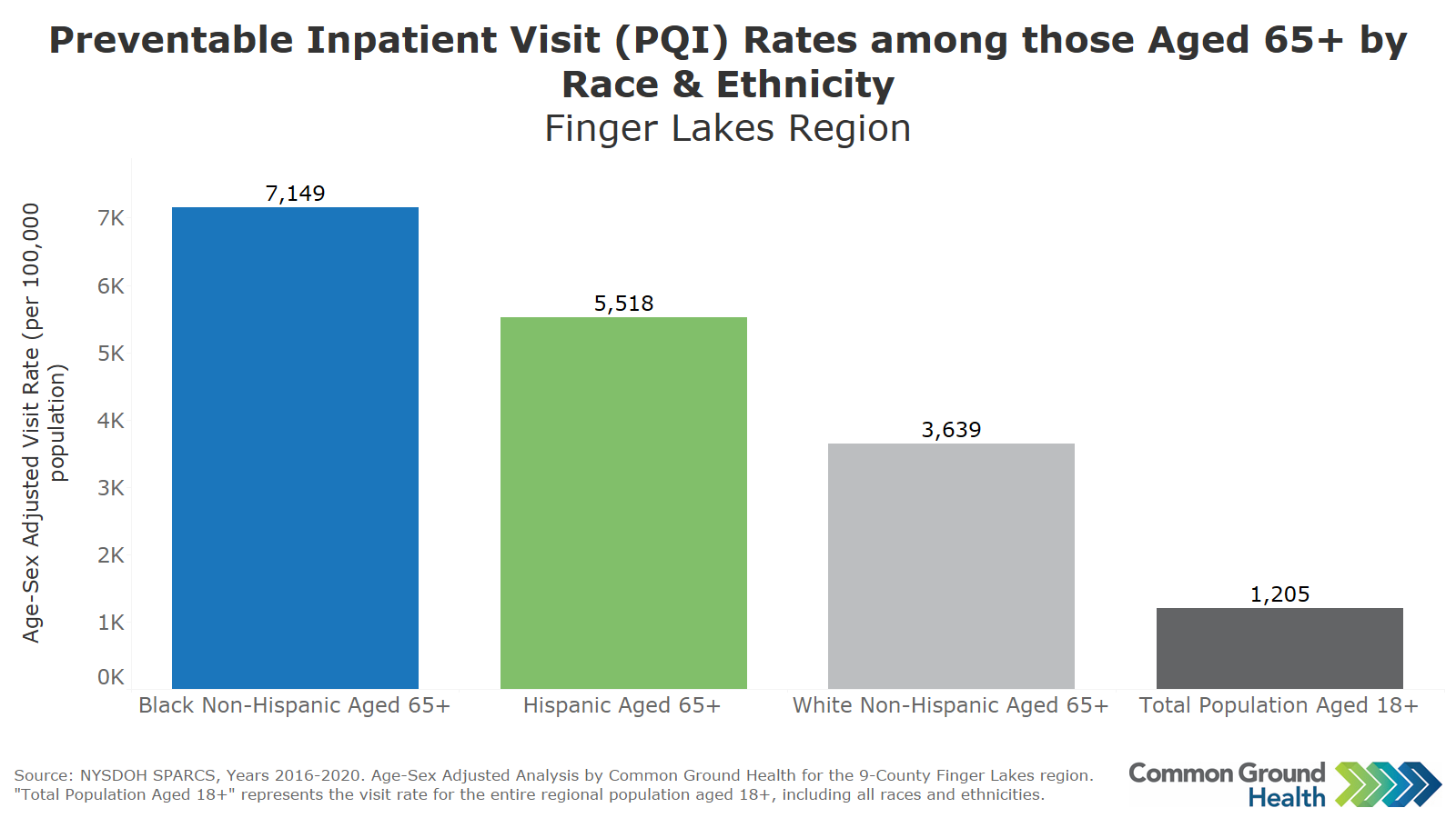 This chart displays the age-sex adjusted visit rate (per 100,000 population) of potentially preventable inpatient visits (PQI) for those aged 65+ within the Finger Lakes region. The dark gray bar represents the PQI visit rate for the total population aged 18+, and includes all races and ethnicities. A higher PQI rate is an indicator that people are not getting needed outpatient preventive care, which then results in hospital visits for health matters that could have otherwise been prevented or treated in the outpatient setting. The first item to note is that, regardless of race or ethnicity, the rates for all three older adult populations are significantly greater than the rate for the 18+ population (approximately 3-6 times higher depending on which group). When comparing solely amongst the three groups of older adults, Black non-Hispanic older adults had the highest rates (1.3 times that of Hispanic older adults and 2 times that of White non-Hispanic older adults). As experienced during the pandemic, avoiding preventable hospitalization for older adults is critical. The lack of equitable prevention services has real consequences for individual patients, population groups and the health care system. This data visualization is part of the Sage II Commission Report.