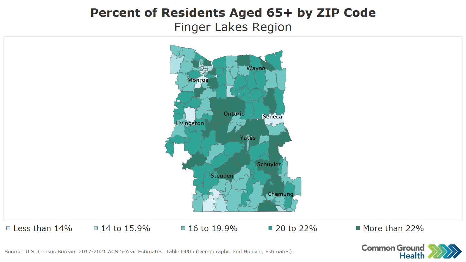 This map displays the percentage of total population that residents aged 65+ comprise within each ZIP code. While there are certainly ZIP codes with higher populations of 65+ residents, one key point to note is that the older adult population is also widespread throughout region: urban, suburban and rural alike. This is an important factor when considering issues of access, whether it be to medical care, grocery stores, transportation services, or other necessities. An understanding of how to access an array of service options as their needs change is critical for the health and wellbeing of this population.