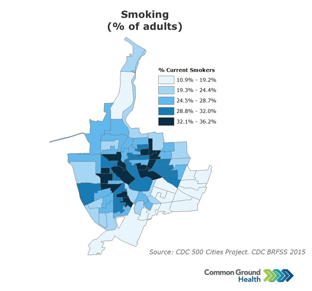 The map below shows estimated smoking rates by census tract for the City of Rochester. The rate within the Focus Area* tracts (28 percent) is much higher than the rest of the city (20 percent).