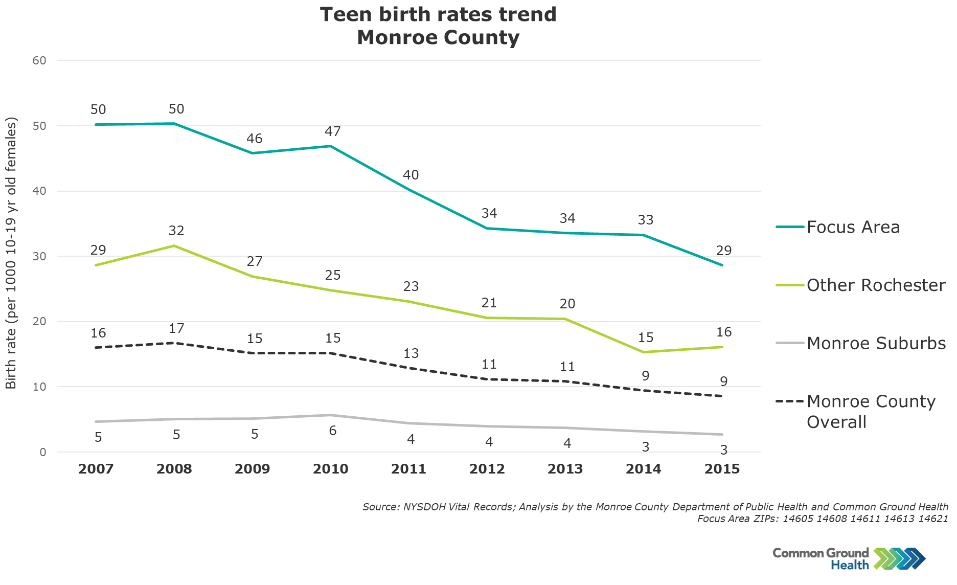 Across Monroe County, teen birth rates have fallen considerably over the past 10 years, especially within the Focus Area* and other parts of Rochester where they have fallen over 40 percent since 2007. However, the birth rates within the city remain much higher than the suburbs, and as the subsequent charts show, there are large differences by race/ethnicity as well.