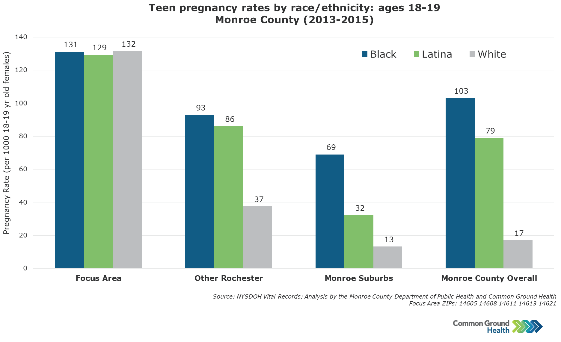 The chart below shows pregnancy rates among older teens by race/ethnicity in different parts of the county. A couple of patterns are striking. First, for each racial/ethnic group, the pregnancy rates are much higher in the Focus Area* compared to the rest of Rochester and the suburbs. However, the racial/ethnic disparity grows as the lens is moved from Focus Area to rest of Rochester to the suburbs. Within the Focus Area, white 18 - 19 year olds have a rate comparable to Latinas and blacks. But the white rates are much lower elsewhere in Monroe County.