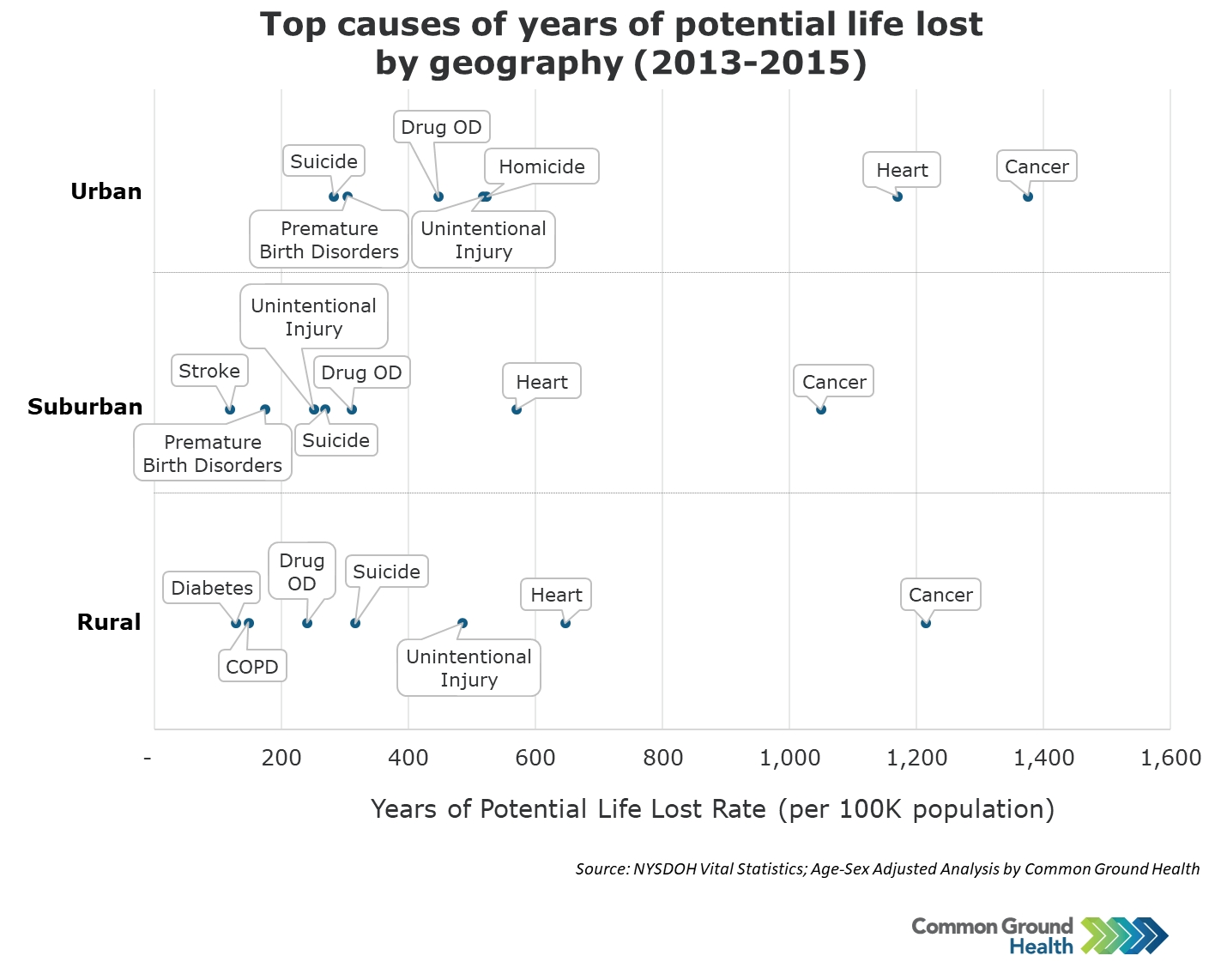 Methodology note: Years of potential life lost (YPLL) is a widely used measure to assess the rate of premature mortality. YPLL places a larger weight on the deaths of younger people, in contrast with overall mortality statistics which are dominated by deaths of the elderly. The YPLL rates in Common Ground Health analyses are derived using 75 years as the baseline. A death at age 65 has YPLL of 10, where as a death at age 35 has a YPLL of 40. The rates are calculated per 100,000 population and are age-sex adjusted to account for differences in population distribution.