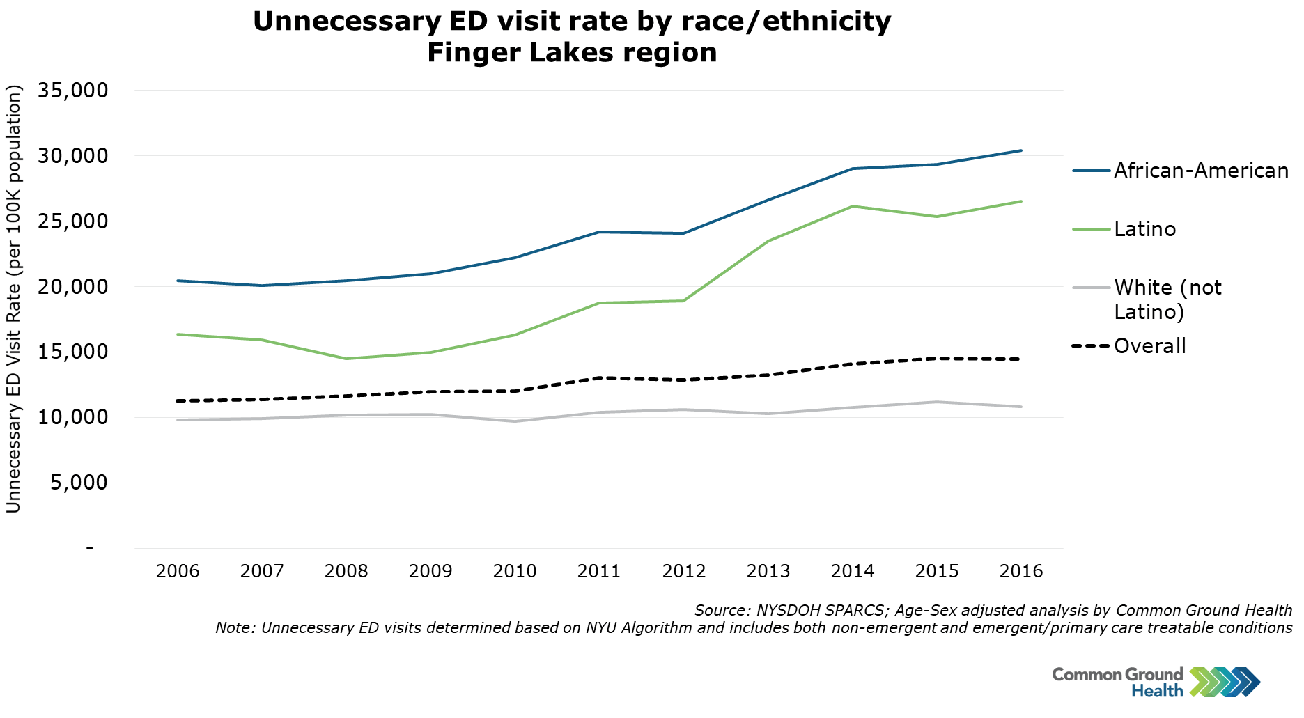 The trend chart below show that while the overall increase in the rate of unnecessary ED visits has been gradual and mild, there has been a more dramatic increase for African-American and Latino urban populations, particularly since 2012. The rate for the white population has been fairly stable.