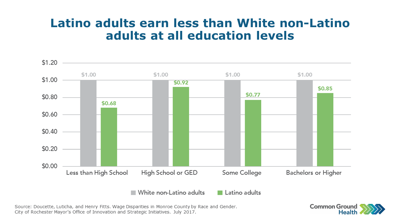 Wage data from Monroe County demonstrate that even when Latino residents achieve higher levels of education, they are still paid significantly less than their non-Latino White counterparts. For example, among people with bachelor’s degrees, Latino workers are paid 85 cents for every dollar paid to White non-Latino workers. Data compares the median earnings of White non-Latino and Latino populations.