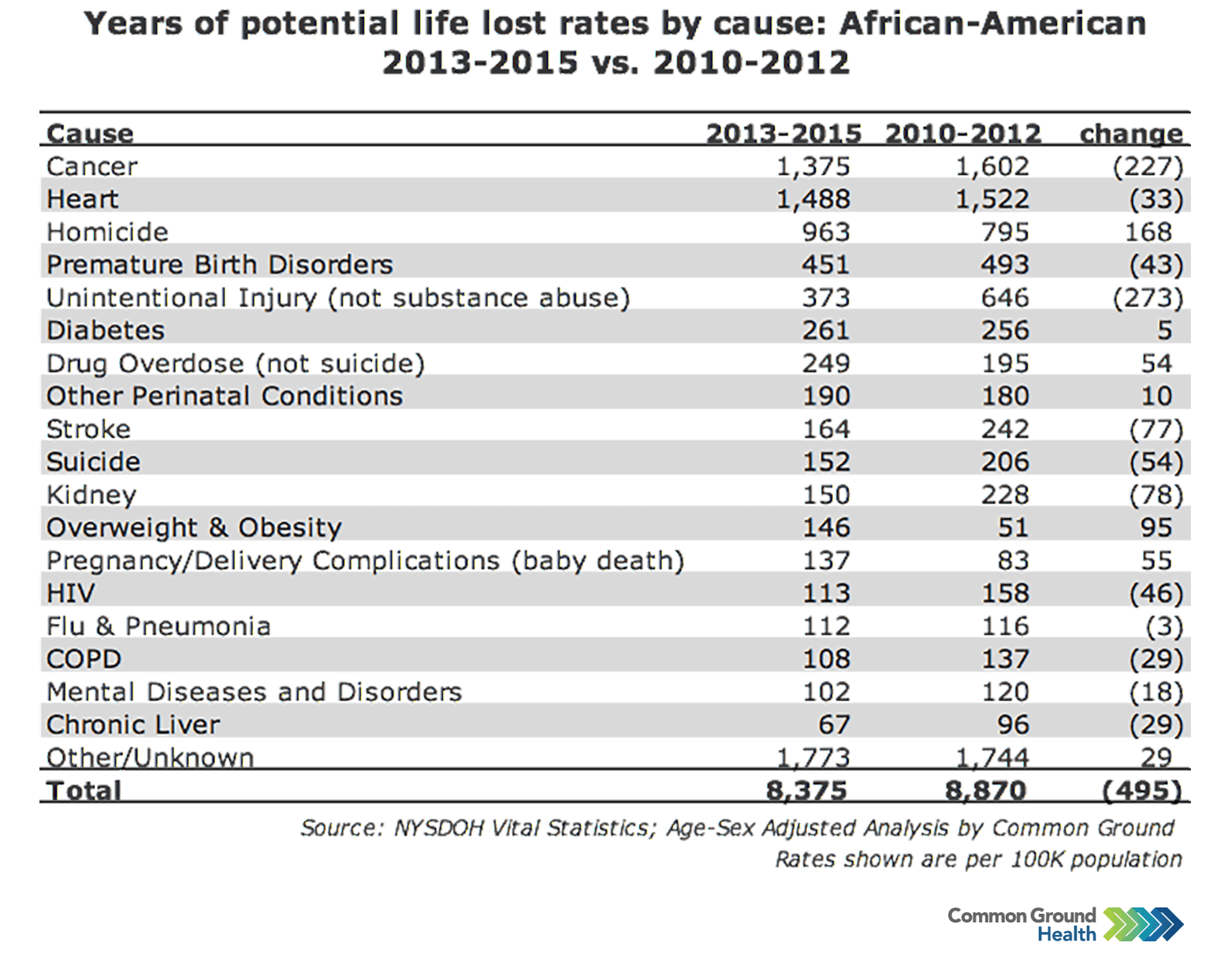 Methodology note: Years of potential life lost (YPLL) is a widely used measure to assess the rate of premature mortality. YPLL places a larger weight on the deaths of younger people, in contrast with overall mortality statistics which are dominated by deaths of the elderly. The YPLL rates in Common Ground Health analyses are derived using 75 years as the baseline. A death at age 65 has YPLL of 10, where as a death at age 35 has a YPLL of 40. The rates are calculated per 100,000 population and are age-sex adjusted to account for differences in population distribution.