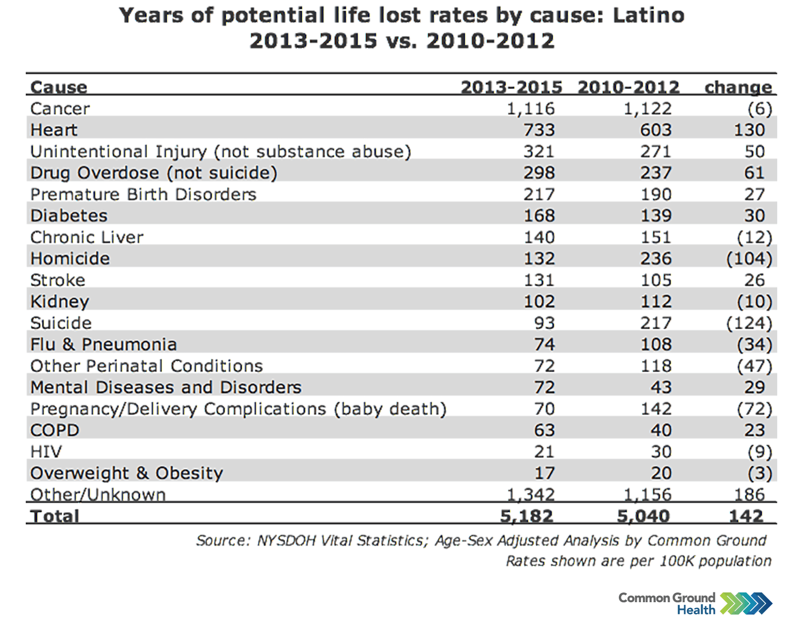 Methodology note: Years of potential life lost (YPLL) is a widely used measure to assess the rate of premature mortality. YPLL places a larger weight on the deaths of younger people, in contrast with overall mortality statistics which are dominated by deaths of the elderly. The YPLL rates in Common Ground Health analyses are derived using 75 years as the baseline. A death at age 65 has YPLL of 10, where as a death at age 35 has a YPLL of 40. The rates are calculated per 100,000 population and are age-sex adjusted to account for differences in population distribution.